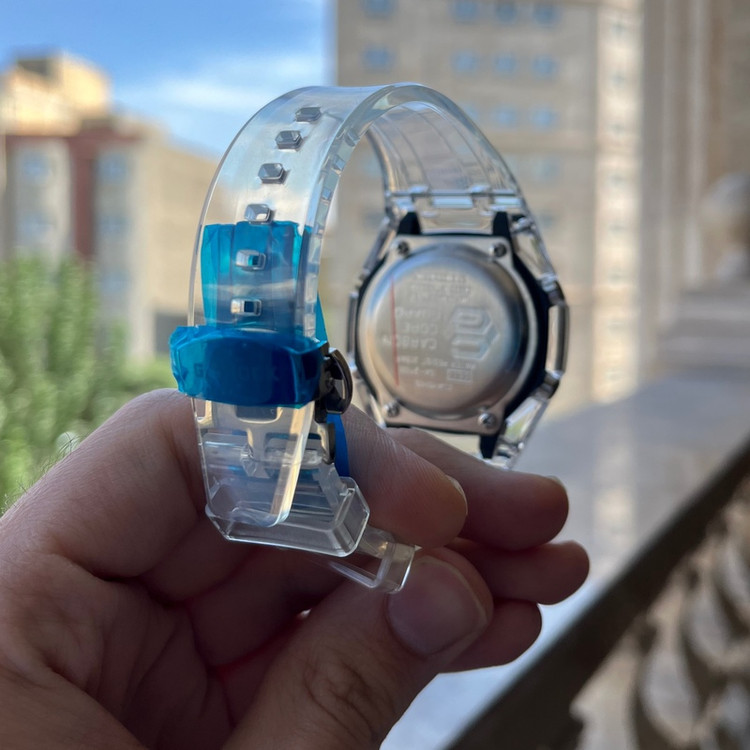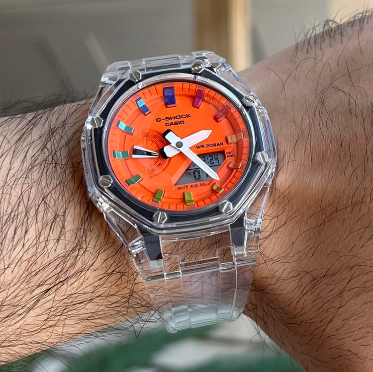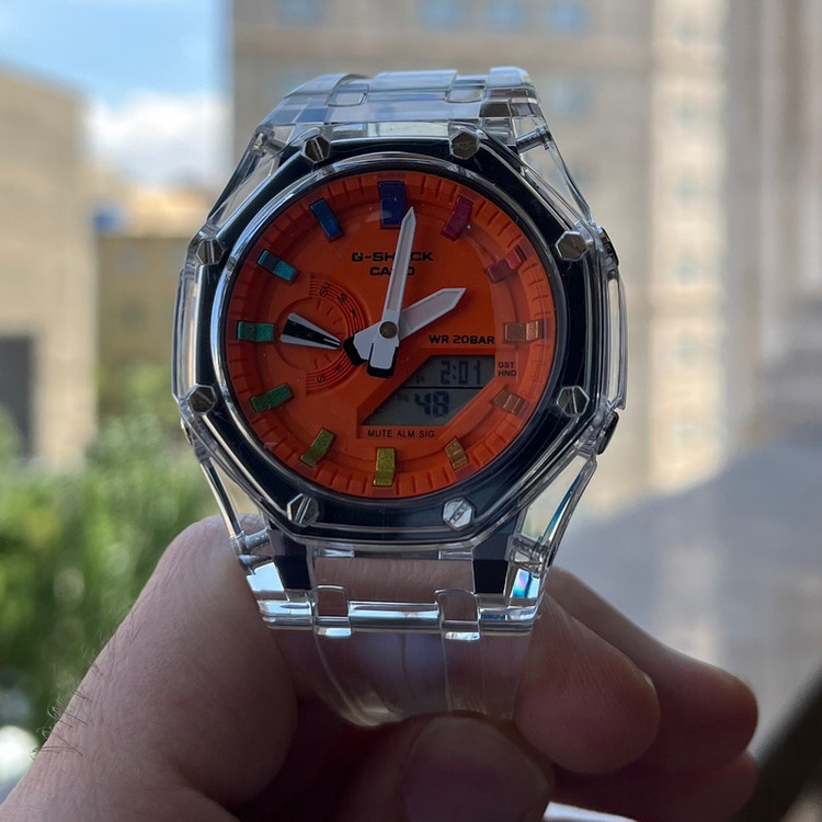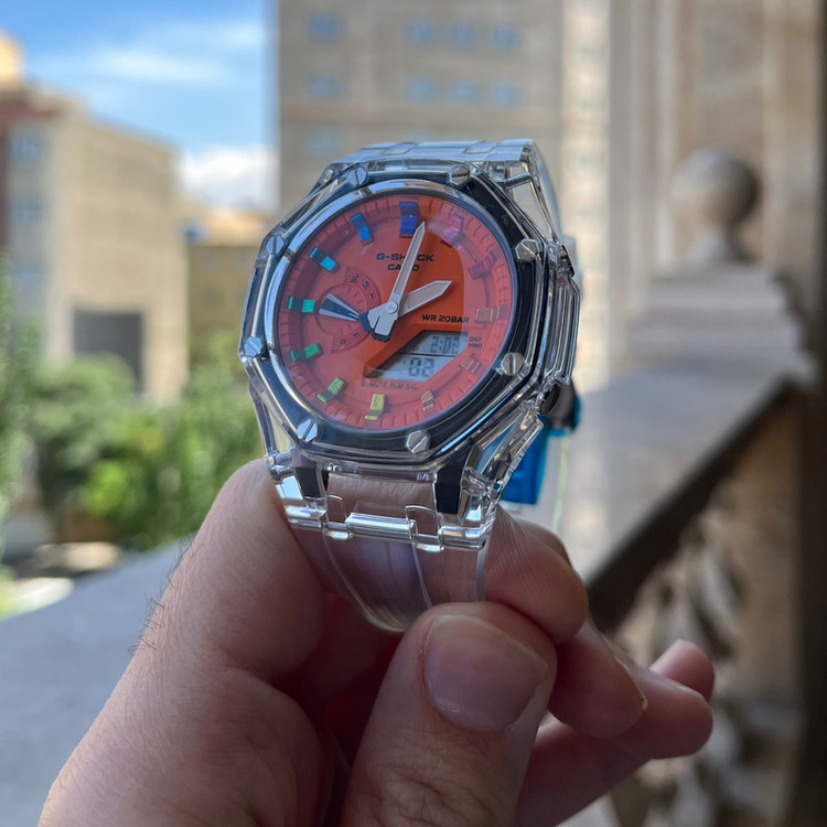 ساعت جیشاک G-Shock مدل ga-2100 با بند شیشه ای و صفحه نارنجی در فروشگاه موجود می باشد. این مدل دارای ساعت جهانی بوده و حدود 50 منطقه زمانی از جمله ایران را پوشش می دهد. همچنین این مدل دارای آلارم، تایمر، روز های هفته، کورنومتر، تاریخ میلادی و چندین ویژگی شگفت آور دیگر است. بند شیشه ای با قاب شیشه ای جلوه ای اسپورت به ساعت بخشیده است. این مدل مقاوم دربرابر آب است و علاوه بر لایت(چراغ صفحه) عقربه های شب نما نیز دارد. این ساعت بالاترین کیفیت ساخت (شرکتی +++A) را در کنار موتور باتری خور ساخت ژاپن اصلی و بدنه کربن مقاوم ضدخش و شیشه معدنی داراست که باعث شده یکی از پرفروش ترین مدل های حال حاضر بازار باشد.