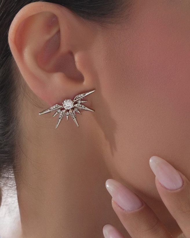 این گوشواره زیبا با طرح خورشید و نگین های مخراج کاری شده می تواند یکی از بهترین انتخاب های نقره ای پسندان یاشد.