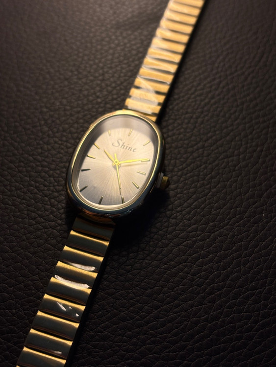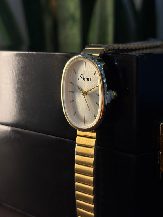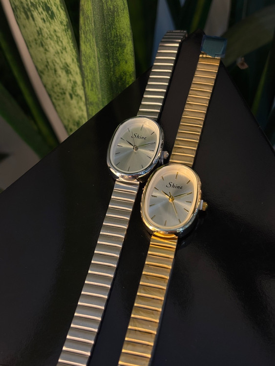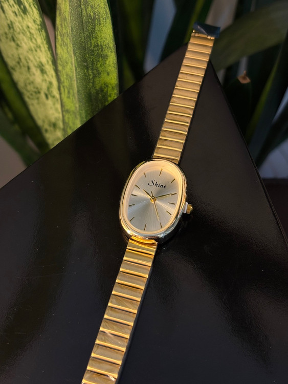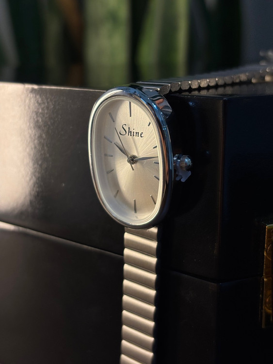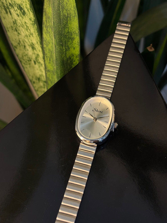 این مدل ساعت دخترانه از برند شاین با صفحه بیضی شکل، ظاهری مینیمال به خود گرفته و قابل ست کردن با هر تیپ و استایلی می باشد.