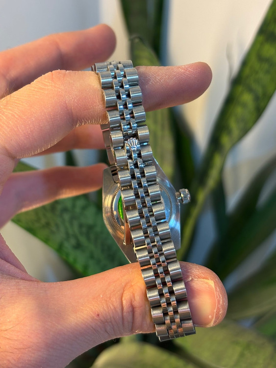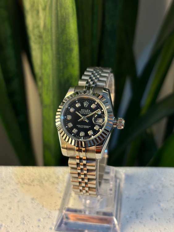 ساعت رولکس دیت جاست زنانه و دخترانه با بند نقره ای و صفحه مشکی در بالاترین کیفیت AAA فول گرید و با صفحه و اندکس نگینی در فروشگاه موجود می باشد. موتور این مدل ساخت شرکت میوتا ژاپن بوده و این ساعت دارای دسته کوک پیچی بوده که باعث افزایش مقاومت دربرابر آب می شود. حک آرم رولکس روی دسته کوک، قفل کلیپسی تاجی( اصلی رولکس ) و بند جوبیلی رولکس در کنار هم باعث هرچه زیباتر شدن این ساعت شده اند. ضمنا این مدل مانند بقیه مدل های دیت جاست دارای تقویم روزشمار می باشد.