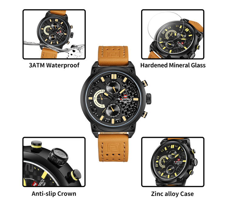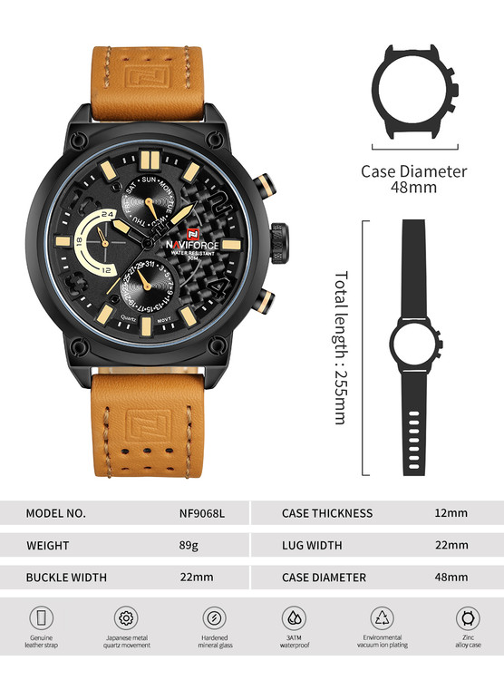 ساعت Naviforce با بند چرم مشکی و عسلی، انتخابی حرفهای و جذاب برای آقایانی است که به استایل مردانه و جدی علاقه دارند. صفحهٔ چندعملکرده با طراحی لایهلایه، جلوهای مدرن و قدرتمند ایجاد میکند و ترکیب آن با بند چرمی مشکی، ظاهری یکدست و بسیار شیک به ساعت میبخشد.