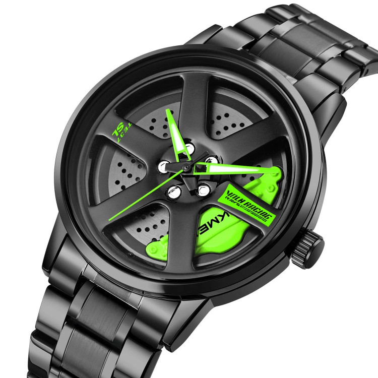 این ساعت خاص با طراحی الهامگرفته از دیسک ترمز و رینگ خودرو، انتخابی متفاوت برای دوستداران سرعت و هیجان است. ترکیب رنگ مشکی مات با جزئیات سبز نئونی، جلوهای مدرن و جوانپسند به این ساعت بخشیده است.