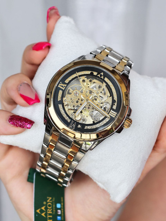 ساعت مچی اسکلتون اتوماتیک مردانه فیتـرون با بند طلایی-نقرهای و صفحه مشکی، ترکیبی از ظرافت، مدرنیته و لوکس بودن است. طراحی اسکلتون حرکت زیبای موتور مکانیکی را به نمایش میگذارد و جلوهای خاص و متفاوت به ساعت میبخشد. موتور اتوماتیک بدون نیاز به باتری، با حرکت دست شارژ میشود و دقت و دوام بالایی دارد. بند دو رنگ طلایی-نقرهای جلوهای چشمگیر و ماندگار ایجاد میکند و صفحه مشکی تضاد شیک و خوانایی بالا را فراهم میکند. انتخابی ایدهآل برای کسانی که به دنبال ساعت لوکس، کلاسیک و متمایز هستند.