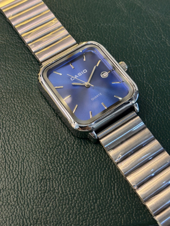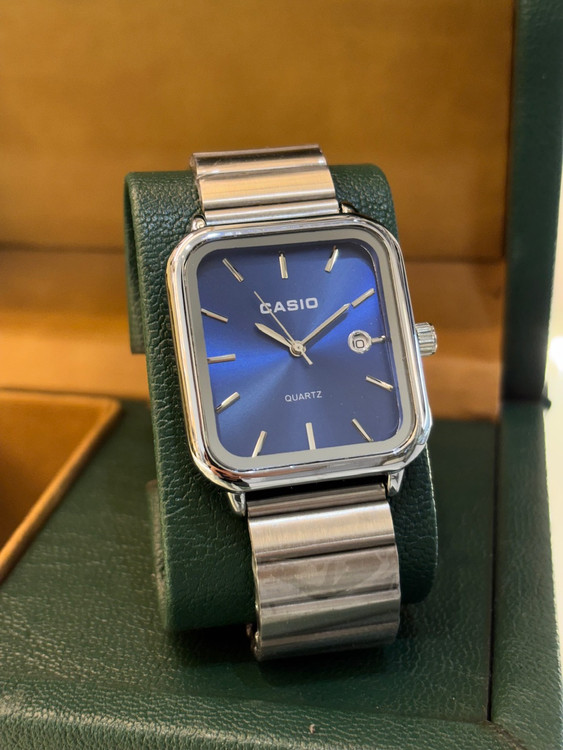 قاب مستطیلی براق و صفحهی آبی درخشان، این ساعت را به انتخابی متمایز برای استایل روزمره و رسمی تبدیل میکند. بند استیل سبک و مقاوم نیز راحتی و دوام را در کنار زیبایی تضمین میکند.