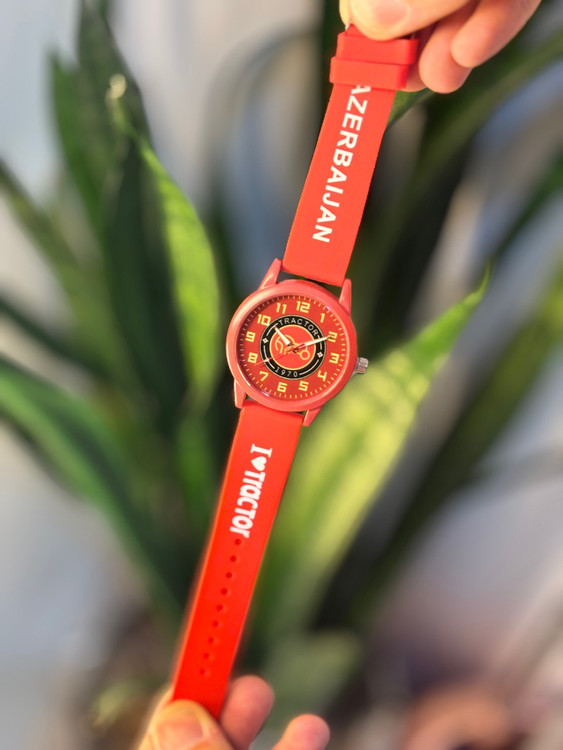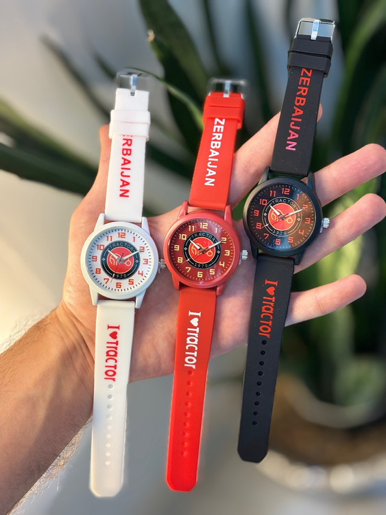 این ساعت در سه رنگ قرمز، سفید و مشکی طراحی شده و روی بند آن عبارت I ❤️ Tractor و AZERBAIJAN حک شده است.