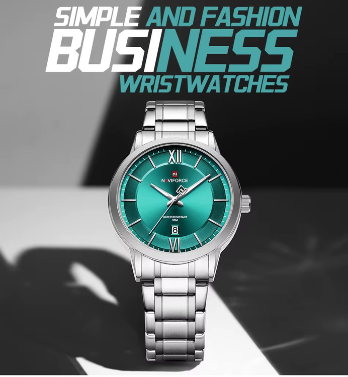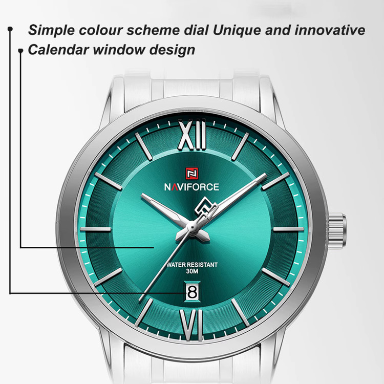 ساعت Naviforce 9254 ترکیبی از طراحی مینیمال و کیفیت عالی است. این ساعت دارای موتور ژاپنی دقیق، بند استیل مقاوم و قفل کلیپسی با عقربه های شب نماست که جلوهای شیک و لوکس به مچ شما میدهد. همچنین این ساعت دارای نمایش تاریخ بوده و برای استفاده روزمره و رسمی مناسب است.