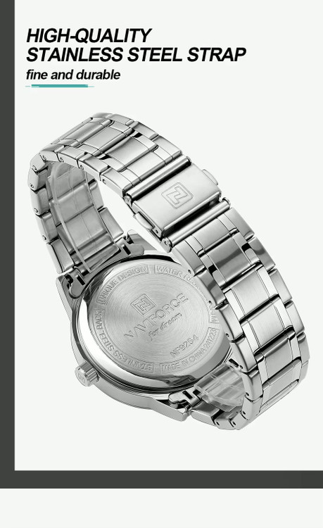 ساعت Naviforce 9254 ترکیبی از طراحی مینیمال و کیفیت عالی است. این ساعت دارای موتور ژاپنی دقیق، بند استیل مقاوم و قفل کلیپسی با عقربه شبنماست که جلوهای شیک و لوکس به مچ شما میدهد. همچنین این ساعت دارای نمایش تاریخ در موقعیت ساعت شش بوده و برای استفاده روزمره و رسمی مناسب است.