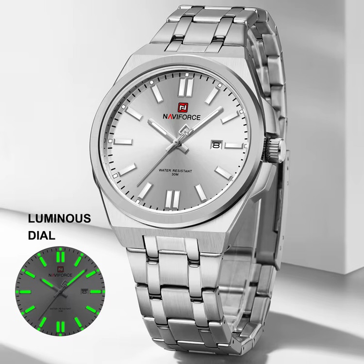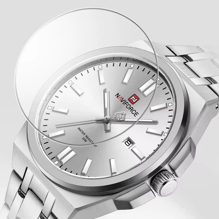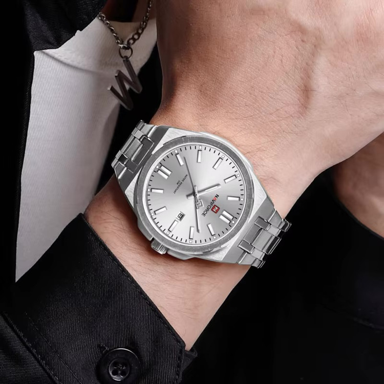 ساعت Naviforce 9226 مدل نقرهای با صفحه نقرهای یکی از گزینههای کلاسیک و کاربردی این مدل است که برای استفاده روزمره، محیط کار و مهمانی مناسب است. صفحه نقرهای ساده و کمی براق، با نشانگرهای مشخص و عقربههای هماهنگ، حسی مردانه و کمی رسمی به ساعت میدهد و بند استیل نقرهای آن با استایلهای مختلف، از لباس رسمی تا روزمره، هماهنگی خوبی دارد.