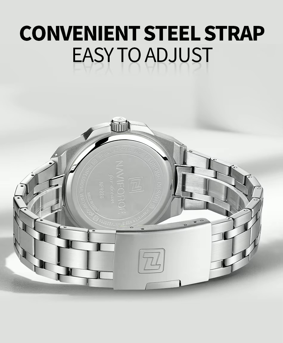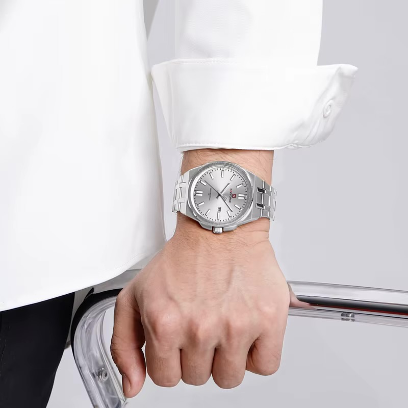 ساعت Naviforce 9226 مدل نقرهای با صفحه نقرهای یکی از گزینههای کلاسیک و کاربردی این مدل است که برای استفاده روزمره، محیط کار و مهمانی مناسب است. صفحه نقرهای ساده و کمی براق، با نشانگرهای مشخص و عقربههای هماهنگ، حسی مردانه و کمی رسمی به ساعت میدهد و بند استیل نقرهای آن با استایلهای مختلف، از لباس رسمی تا روزمره، هماهنگی خوبی دارد.