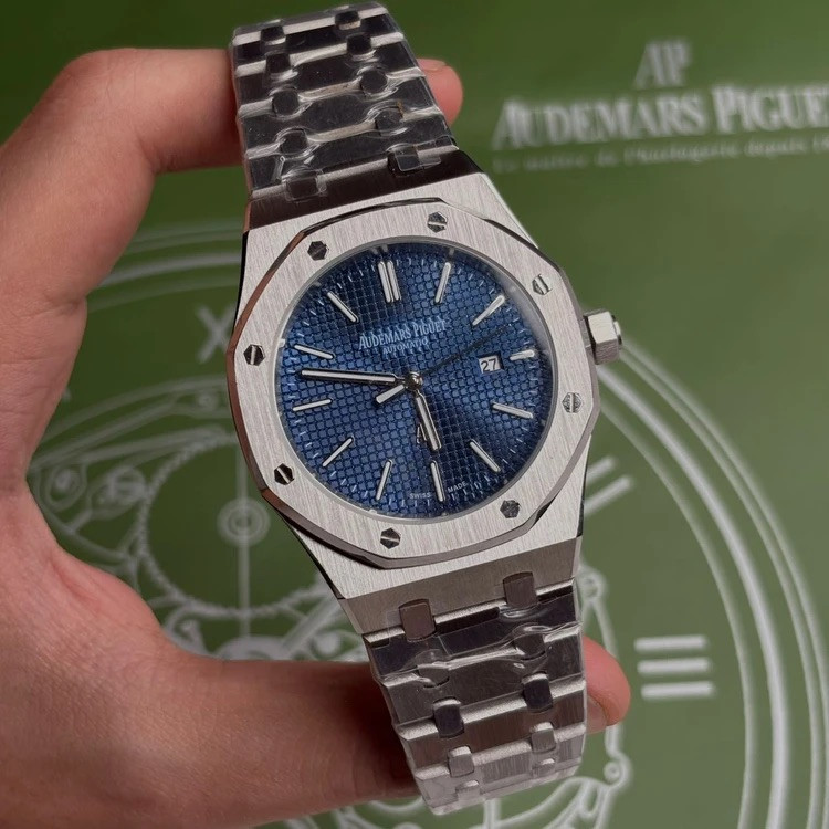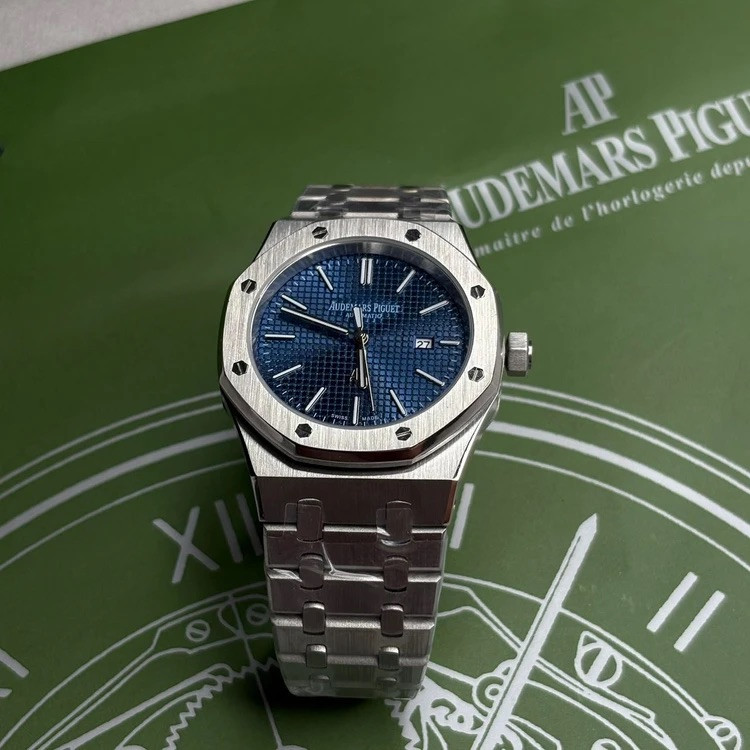 ساعت مردانه AP مدل رویال با طراحی خاص و اصیل، یکی از جذابترین مدلهای الهامگرفته از برند Audemars Piguet است. قاب هشتضلعی استیل برسخورده با پیچهای مشخص و بند استیل یکتکه، ظاهری لوکس و مستحکم ایجاد کرده است.