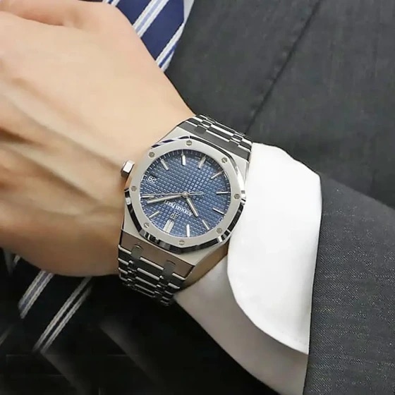ساعت مردانه AP مدل رویال با طراحی خاص و اصیل، یکی از جذابترین مدلهای الهامگرفته از برند Audemars Piguet است. قاب هشتضلعی استیل برسخورده با پیچهای مشخص و بند استیل یکتکه، ظاهری لوکس و مستحکم ایجاد کرده است.