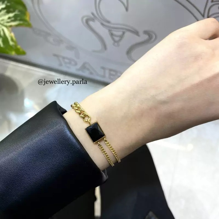این مدل دستبند کارتیر با زنجیر دولاین و نگین سنگی یکی از خاص ترین مدل های سنگی مجموعه می باشد.جنس زنجیر استیل بوده و رنگش کاملا ثابت است. استیل 316 به کار رفته دربرابر خوردگی مقاومت زیادی دارد. کار کاملا ضد حساسیت بوده و البته گردنبند این مدل هم در پارلا اکسسوری موجود می باشد.